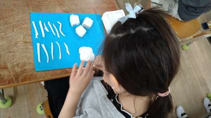 油粘土を使って思い思いに色々なものを作っています。今日、袋から出して初めて使っています。ホットドック、メロンパン、歌うステージなどを楽しんで完成させています。