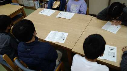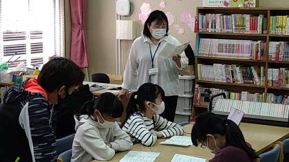 学校図書館司書の松下さんが本の借り方、図書館での過ごし方などをていねいに説明しています。子どもたちはリーフレットを見ながらしっかり話さ聞けています。