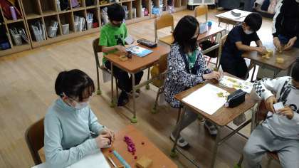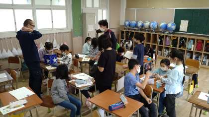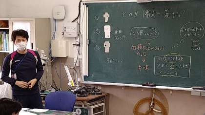各グループに3種類の立体の展開図を配り、組み立てた時にできる箱はどれが1番大きくなるのかを考えています。見た目だけでははっきりしないので、組み立てた箱に1cm?の立方体を敷き詰めています。
