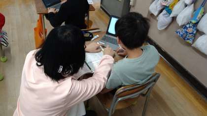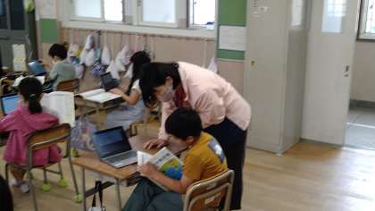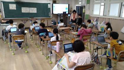 タブレット端末を使って作成しています。ヒントは3つから4つと指定されています。地図帳などを参考にしてヒントを考えています。3年の総合的な学習でたくさん活用したので操作はスムーズです。