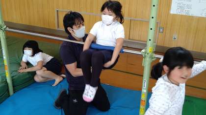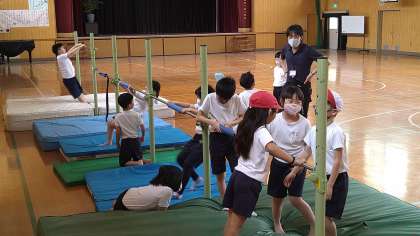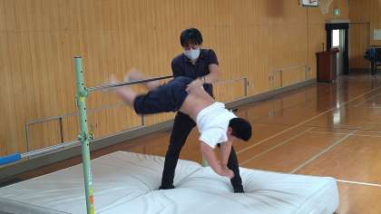 今、取り組んでいる技は「だるま回り」です。もう少しでできそうな児童に「脇を締めて、もう少し勢いをつけたらいいよ。」とアドバイスをしています。