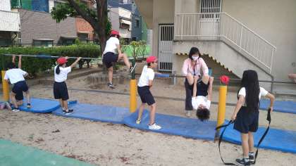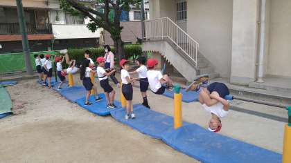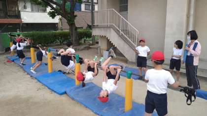 鉄棒は、地球回り・こうもり(振り)・だるま回り・逆あがりに取り組んでいます。だるま回りは見ているだけで目が回りそうです。