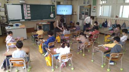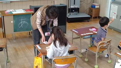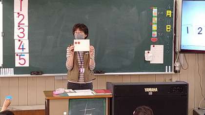 1から5のカードを使い、指導者の提示する大きいカードにあるドットの数にあわせて数字カードをあげています。2つのカードをあわせたドットもきちんと出せています。