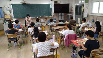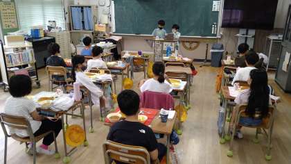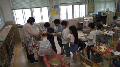 4年では配膳が終わり「いただきます。」をした後、先におかずやパンを増やしたい人数にあわせて担任が分けています。また、食べ始めたらすぐに担任が読み聞かせをしています。