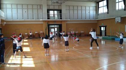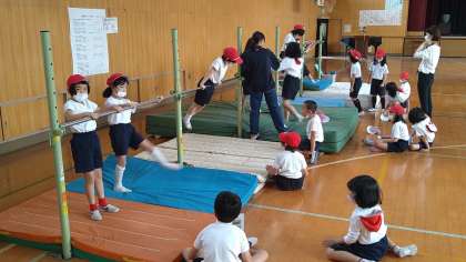 これまでは、鉄棒の高さにあわせてグループを分けていましたが、今日はどんどん挑戦したいグループと1つ1つの技を確実に取り組むグループに分けています。次が最後の学習になります。これまでの練習の成果を発表します。