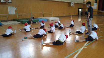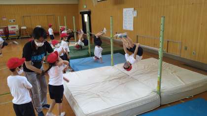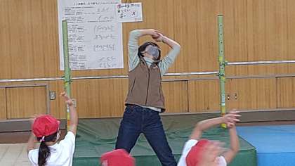 体操は、体を曲げたり、ひねったりする動きや座って体を伸ばすストレッチのような動きをしています。鉄棒は布団干しのようにのったり、足をかけて逆さにのったりして楽しんでいます。