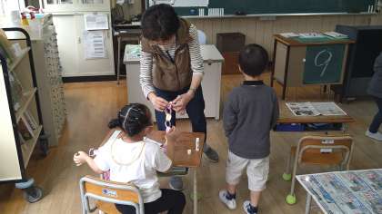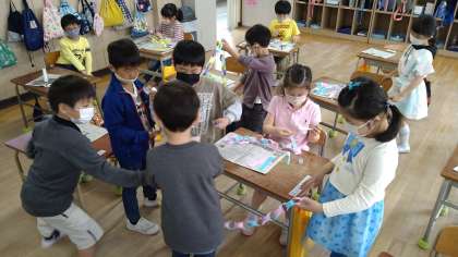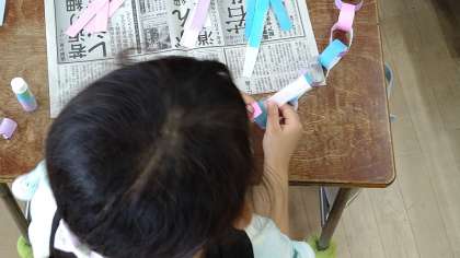 折り紙を短冊状に切ったものを輪っかにしてつなげていく飾りです。一人一人が作ったものを完成させて、全員のものを1つにつなげていきます。