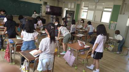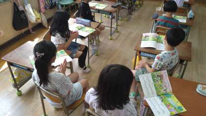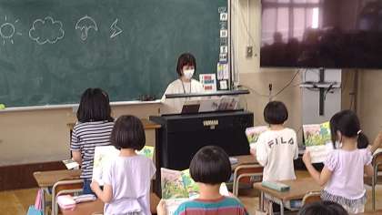 初めに伴奏にあわせて歌いました。その後、グループに分かれて歌と手拍子と足踏みをあわせる練習をしました。歌は2年生らしくいきいきと元気な声を響かせています。
