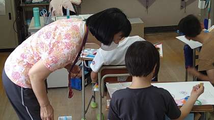 パスと絵の具を使って色を塗っています。カラフルな山をえがいている子どもたちがたくさんいます。ぼかしやにじみ、スパッタリングなどの技法も活用しています。