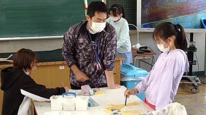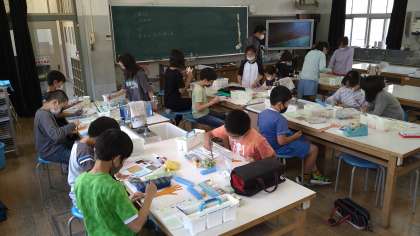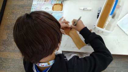 この作品の完成はまだ少し先になります。今日は「手」の制作(着色)です。前回の時間に画用紙を手の形に切ったものに重ね塗りをしています。