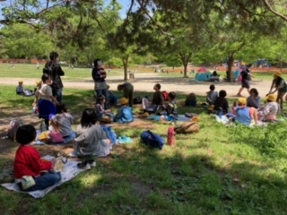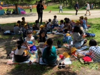 たくさん遊んだ後、お弁当を食べました。おやつタイムも始まりました。この後広場でも遊びます。