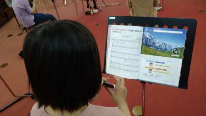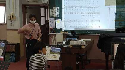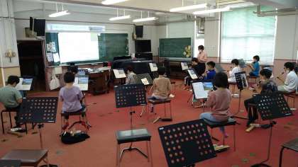 感染症対策を徹底して学習を進めています。密にならないように座席の間隔を空け、同じ方向を向いて歌ったり、リコーダーを吹いたりしています。上下のパートに分かれて練習しています。