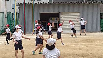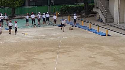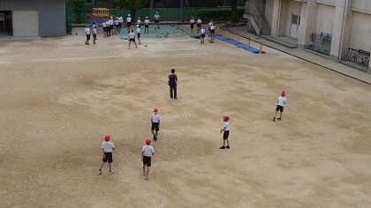この時間は「ソフトボール投げ」をおこなっています。2人1組になって赤白玉(玉入れ用)でキャッチボールをし、同じ大きさで少し軽いボールで練習したあと、ソフトボール投げをおこなっています。