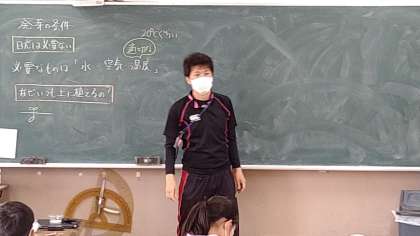 前回の学習で出た考えをさらに深く掘りさげています。必要な条件は「水・空気・温度」であることがわかりました。どのくらいの温度がいいのかや、なぜ発芽に絶対に必要な条件ではない土に植えるのかについて考えています。