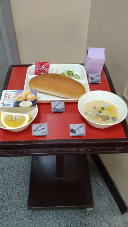 デザートは河内晩柑でした。1人分は1/4個でした。食べやすいようにその半分(1/8)のところに包丁で切れ目を入れています。