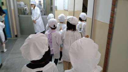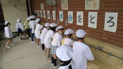 2列に並び前後の間隔を少し広く(コロナ感染予防のため)とって歩いています。運動場に面した手洗い場で石鹸を使い手を洗ったあとアルコール消毒をします。給食室の児童溜でそれぞれの役割の運ぶものを持って教室へ向かいます。