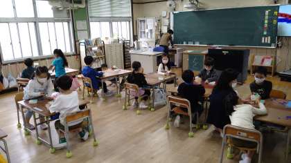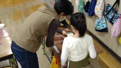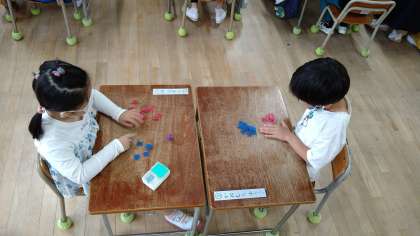 おはじきを使って数の分解をしています。2人1組になって4までの数を分解し、その数のおはじきを左右の手のひらに分けて握り、数の当て合いをしています。楽しんで活動しています。