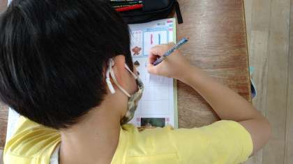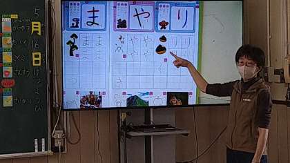 この時間は「り」「や」の練習をしています。一文字ずつ書ける小黒板を使って練習しています。小黒板は十字の点線が引かれています。4つの部屋に分かれているので、どの部屋から書き始めてどこの部屋で止めるなどていねいに進めています。