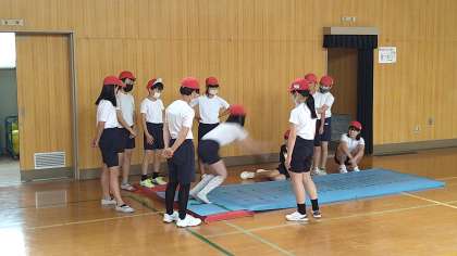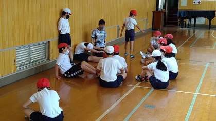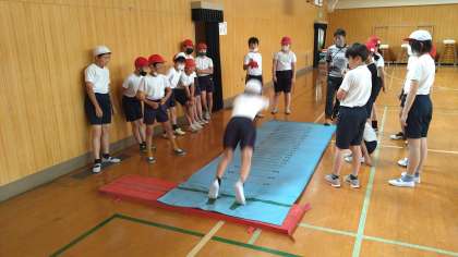 長座体前屈と立ち幅跳びの2種目の練習です。2つのグループに分かれておこなっています。長座体前屈は指導者がついておこなっていますが、立ち幅跳びは子どもたちだけで声をかけ合って練習しています。