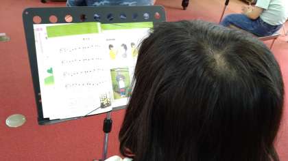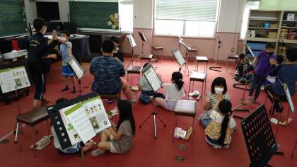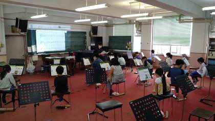 1番と2番の歌詞の確認をしたあと、2人1組になってリズムに合わせて手合わせをしています。曲が終わるとペアを替えておこなっています。