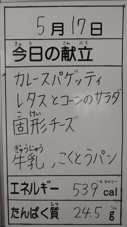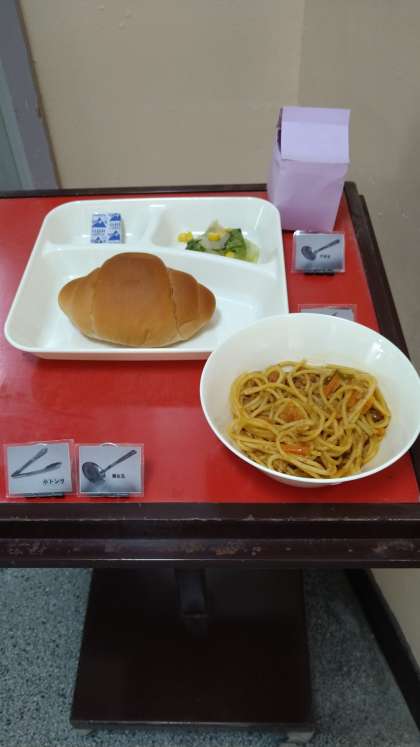 今日の大おかずはカレースパゲティです。給食の中でも人気のカレーとスパゲティのコラボメニューとなっています。給食はできあがってから少ししてから食べるのでスパゲティの麺は少しかために茹でています。