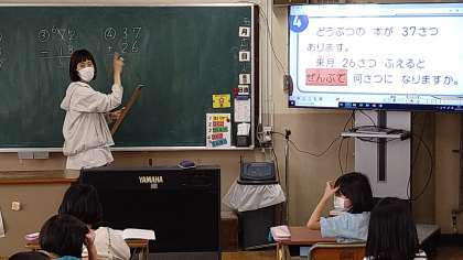 このあとの単元テストに備えた復習です。繰りあがり、繰りさがりのあるたし算・ひき算がテスト範囲となっています。筆算を使って計算する時に気をつけることや文章題のどの部分で計算の仕方を決めるかを確認しています。