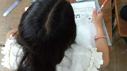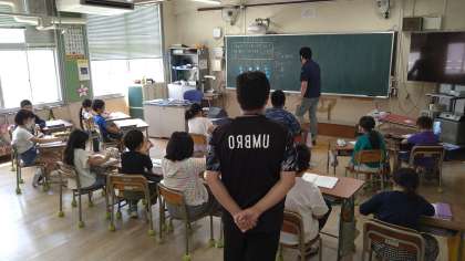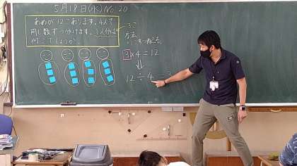 前回の学習では、わり算の考え方を学習ました。今日の学習では、わり算の式やわる記号(÷)のかき方を学んでいます。子どもたちからは、「かけ算とわり算は逆になっている。」という意見が出ています。たくさんの子どもたちが賛同しています。