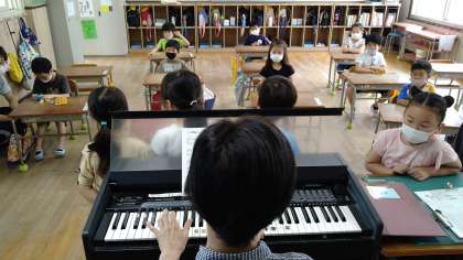 日直だけではなく、係の子どもたちも活躍します。朝の会で歌う歌を決めてみんなにお知らせする係が前へ出ています。今日の曲は「さんぽ」の3番です。