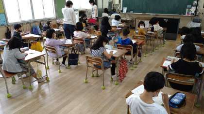 今日は算数プリントの答え合わせです。表裏に左右に分かれて5問ずつ合計20問あります。5問ずつで答え合わせをする子どもが変わっています。