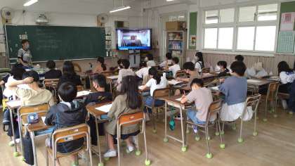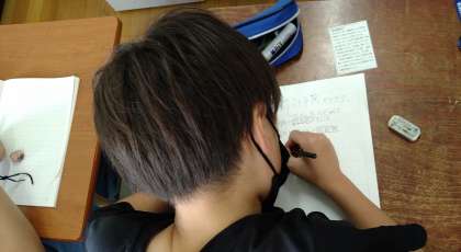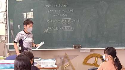 通常の裁判と裁判員制度の違いを学習したあと、ある裁判の事例をもとに考えています。「もし君たちが裁判員ならどのような判断をくだしますか。」という問いかけに対して自分の考えをノートに書き、考えを交流しています。