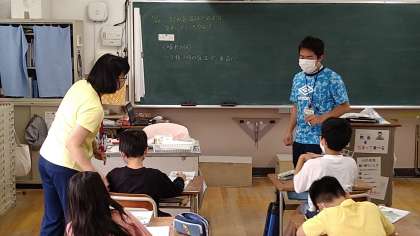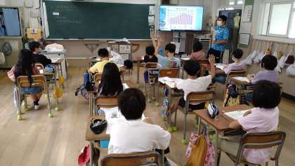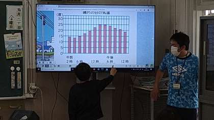 この単元は、T1(前で進める指導者)とT2(机間を巡る指導者)が替わって指導します。この時間は1日の気温の変化を表した棒グラフの図を使って学習を始めています。