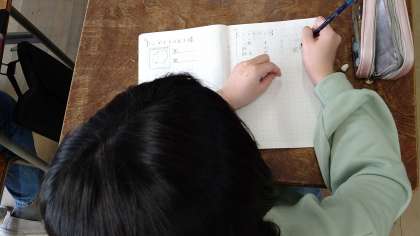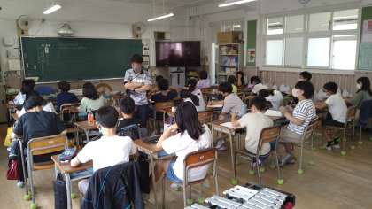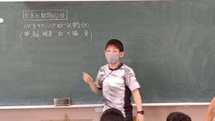 初めに「ヒトが生きていくために必要なもの」を子どもたちに問いかけました。子どもたちからは、心臓・脳・血液・肺・肝臓などたくさんの体にまつわる言葉が発表されています。