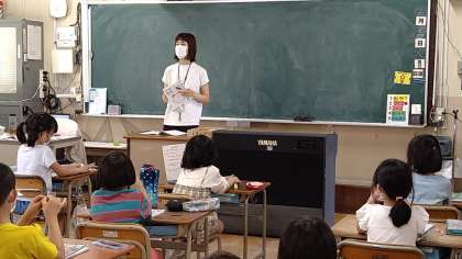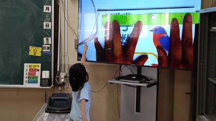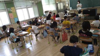 算数の教科書の横の長さを測っています。付属の紙のものさしを使って測っています。教科書の端とものさしの端をきちんと揃えないと正しく測れないことを発表しています。
