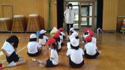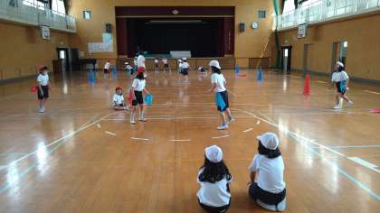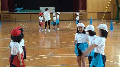 シッポ踏み鬼ごっことシッポ取り鬼ごっこをしています。シッポ踏みは長いスズランテープを足で踏みシッポを抜き取る鬼ごっこです。シッポ取り鬼ごっこは30cm四方のナイロン製のフラッグを腰に挟み取り合う鬼ごっこです。シッポ取りは自分のものを取られないように相手のものを取る難しさがあります。