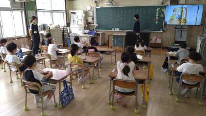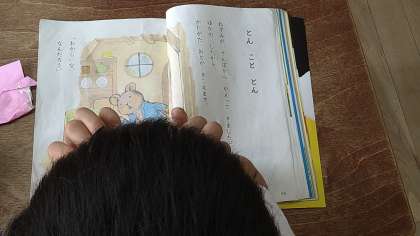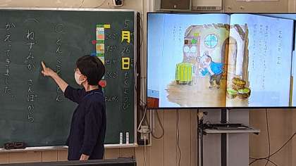会話文を順番に読んでいます。繰り返し練習しているので読み方が上手になってきています。地の文(会話ではないところ)は声をあわせてみんなで読んでいます。