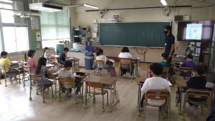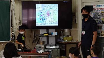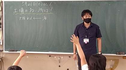 地図の分布図を見て子どもたちが気づいたことを発表しています。大阪府の海沿いに多いことや東西南北に気づき西側に多いと発表しています。