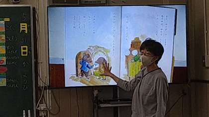 引っ越してきたもぐらの場面です。もぐらのあいさつのあとのねずみの言葉を想像しています。考えた言葉をどんどん発表しています。