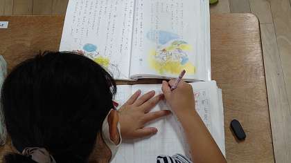 登場人物(主人公)であるえっちゃんときつねの出会う場面です。きつねと出会った時のえっちゃんの気持ちを文章から読み取っています。