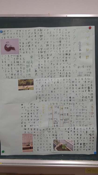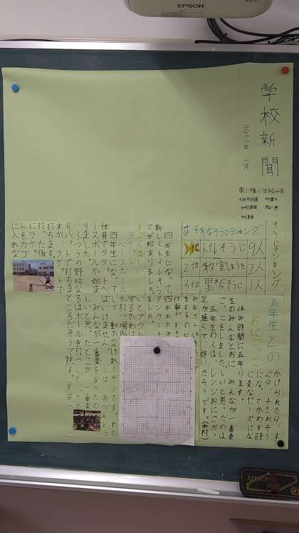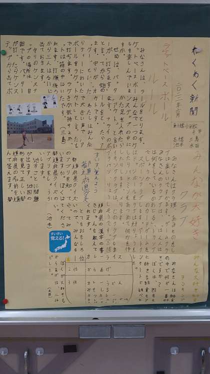1人1人の役割で制作した記事を大きな模造紙に貼る作業をしています。好きなそうじランキング、クラブ活動、春の遠足などの記事を書いています。