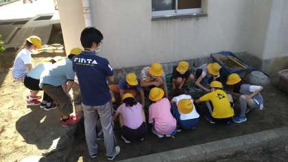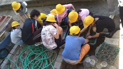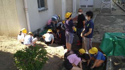 今年の5年は米作りをおこなうことになりました。体育館裏の大きめの学習園を田んぼにするために管理作業員さんを中心に大がかりな作業をしました。今日は、鳥よけネットを作成しました。秋の収穫が楽しみです。