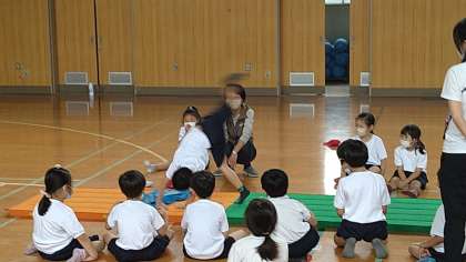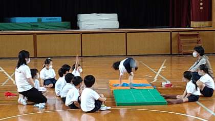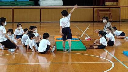 マットを2枚つなげて1人ずつ発表しています。技はピョン・ピョン・ピョンと跳ねて、川に見立てたゼッケンを側方倒立回転(側転)で越える川跳びです。