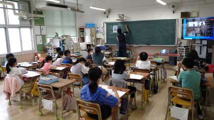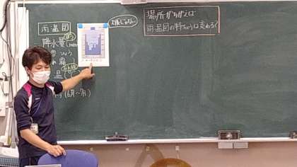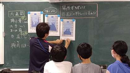 まず、1枚の雨温図を黒板に提示し、雨温図の基本的に見方を確認しています。そのあと、2枚目・3枚目・・・と合計6枚の雨温図を提示し、それぞれの雨温図の違いを降水量と気温をもとに子どもたちに考えさせています。