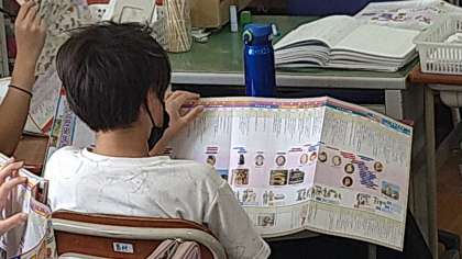 この時間は歴史に興味をもたせるために年表を見ています。たくさん表記されている歴史上の出来事から興味をもった年代を見つけています。