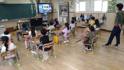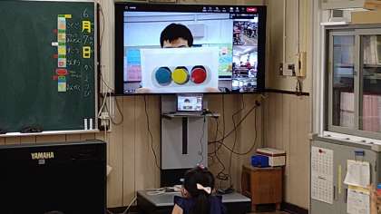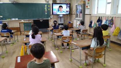 この時間は1・2・3年生が同時におこなっています。止まれの標識、信号、歩き方など安全に関することを教えていただいています。1年生もしっかり警察官の話を聞いています。