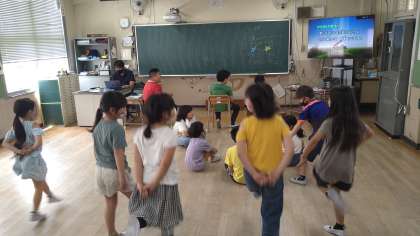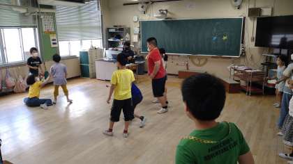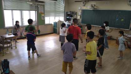 6月が誕生月の児童は2名います。その2人には、首飾りがけられています。前半は中盤までは教室で、後半は体育館でおこなっています。教室ではゲームや歌など、体育館ではドッジボールをします。