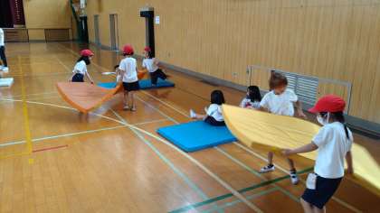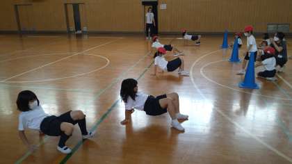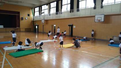 マットを準備する前に感覚づくりの遊びをしました。今日は体幹を使うクモ歩きをしました。そのあとマットを準備し、えんぴつ転がり、四つんばい転がり、前転がりなどをおこなっています。