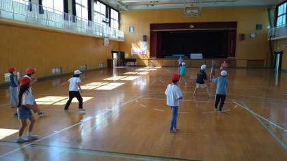 学級での話し合いで2つのことをおこなうことが決まりました。ドッジボールでは、同じ児童が続けて投げないで、まだ投げていない児童にボールを渡しています。バドミントンはネットはなしでペアで打ち合っています。