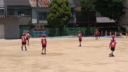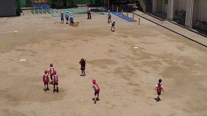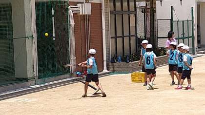 4年のベースボール型ゲームは、今日が最後の学習になるのでルールで困ることもなくゲームを楽しんでいます。ボールはティーに置いて打ちます。ラケットかバットは、ゲームぎ進むに連れて、状況に応じてチームで考えて選択して打っています。