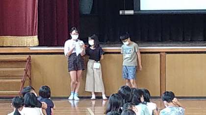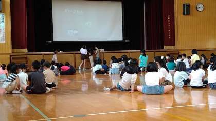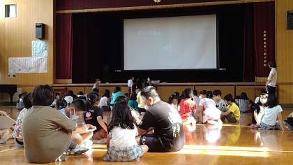 今日はたてわり班で集まり、集会委員会主催のゲームをしています。今日のゲームは「イントロクイズ」です。