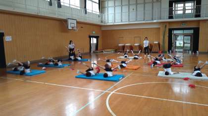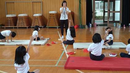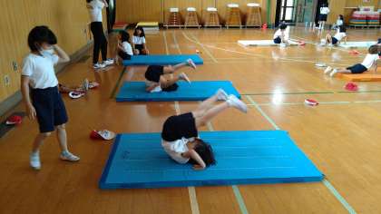 背支持倒立での足じゃんけん・ブリッジ・前転がり・後ろ転がりなどをおこなっています。ブリッジは「逆U」になるくらいに柔らかい児童がいます。前転がりもきれいな前転になっている児童がいます。